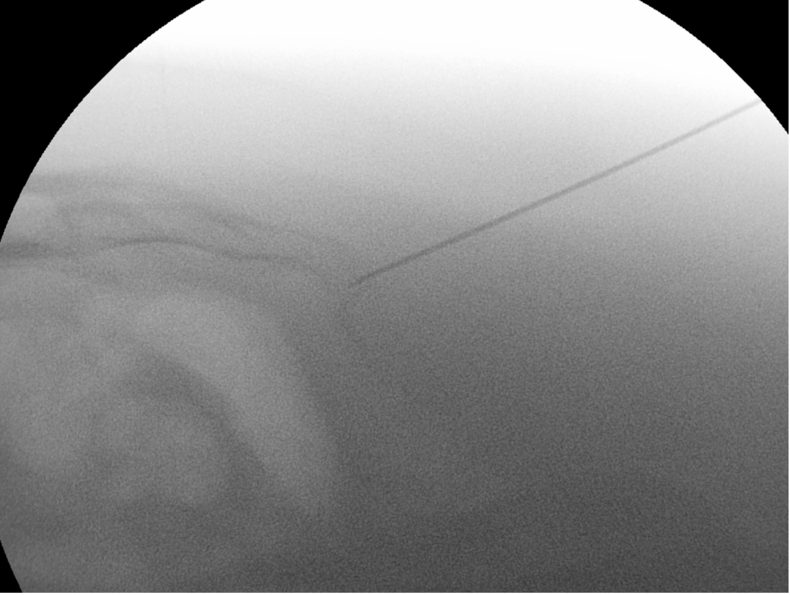 The procedure is quite simple and is best performed in the operating room with a brief sedative administered by an anaesthesiologist. Video X-ray is used to guide a needle into the joint(s), and local anaesthetic and steroid are injected (Figure 6).