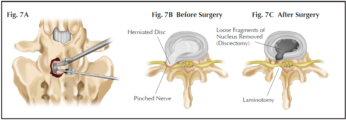 A bone opening (called a 'laminotomy') is created between two laminae to allow the surgeon to see the spinal canal. The nerve root is moved out of the way, the herniated intervertebral disc is exposed and the surgeon removes the loose disc material to relieve the pressure on the nerve (Fig. 7).