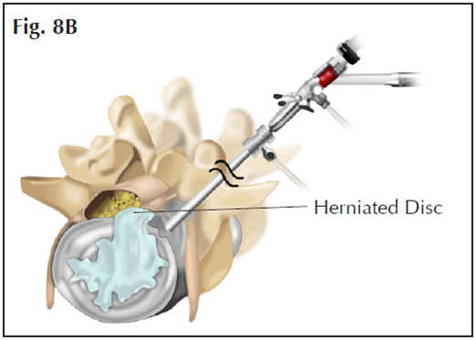 Figs. 8A & 8B An endoscopic discectomy using an endoscope and special instruments is performed through a very small skin incision. | |
