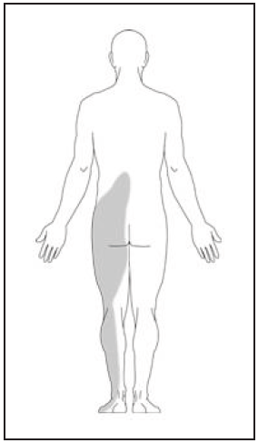 圖3. 坐骨神經痛的典型疼痛位置:從臀部開始感到陣痛和麻痺,然後伸延至大腿後方,甚至向下伸延至腳掌。 |
