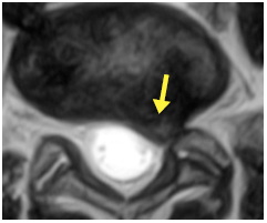 ![]() 圖5B. 相同磁力共振掃描的水平平面圖像,顯示在 L5 / S1 位置出現椎間盤突出,並擠壓左面 S1 神經(箭咀所示)。 |