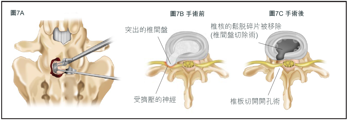 傳統的椎間盤切除術需要切開皮膚,再將背部肌肉移至側面,讓醫生可以看到椎板(椎骨後部形成的骨)。通常會在兩塊椎板之間鑿開(稱為「椎板切開術」),讓醫生看到椎管。在過程中,神經根會被移開,顯露突出的椎間盤。醫生會移除鬆脫的椎間盤部分,以減輕神經的壓力(圖7)。