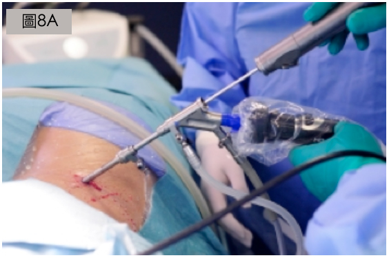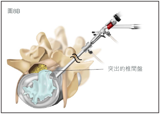 脊椎內窺鏡手術近年的發展,讓醫生能以更細小的皮膚切口進行椎間盤切除術。 當中一個微型相機經過非常細小的孔插入椎管內(圖8)。醫生會觀看屏幕進行手術。